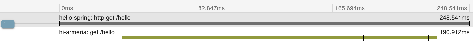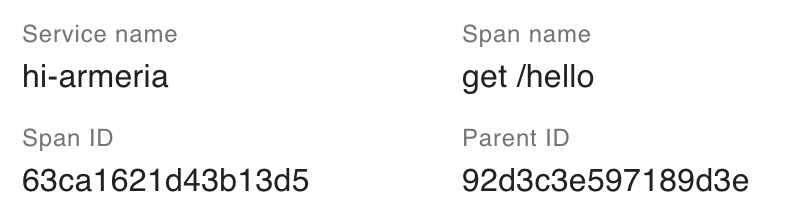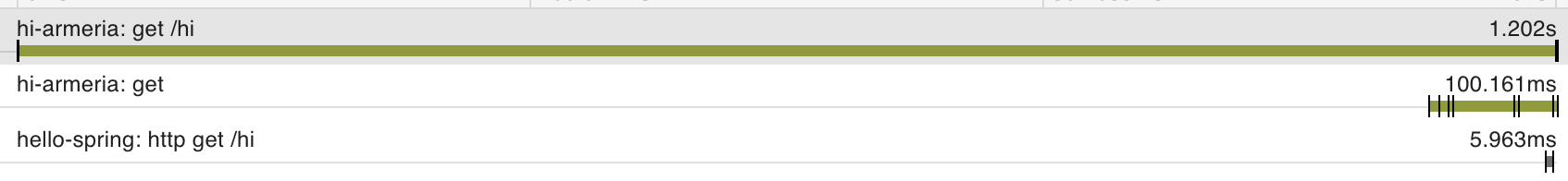 마지막으로 Zipkin 서버에 접속해 확인해보면 해당 요청이 Spring → Armeria를 거쳐 처리되었다는 사실을 확인할 수 있습니다. Armeria span에서 parentId가 Spring span의 아이디와 일치하는 것도 확인할 수 있습니다.